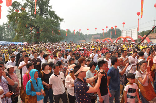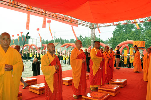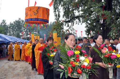 夜里阴雨连连,天明时分仍然雾霾重重,上午10时突然云开雾散,艳阳高照,一晴如洗。一向寂静偏僻的白马寺村,此刻红旗招展,彩旗飘飘,100多道巨大的红色拱门从村头排到白马寺遗址。锣鼓唢呐,震耳欲聋,秧歌队、舞蹈队在唢呐声中翩翩起舞。身穿居士服的善男信女手捧鲜花在前面引路,将前来出席法会的各地高僧大德迎送到千年银杏树下临时搭建的贵宾室,百余位身着黄色服装的义工整齐排列在会场主席台的周围,敬候贵宾入席。