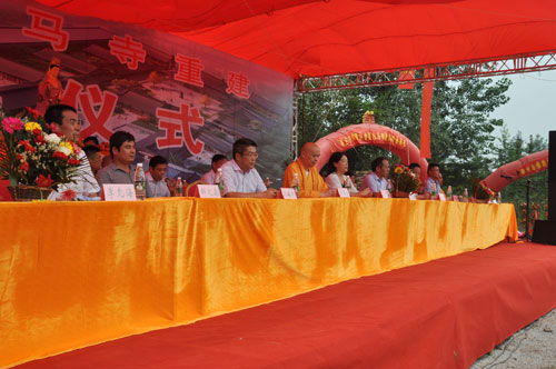 上午10时30分,法会在悠扬悦耳的唱经声中启动。果光大和尚亲自上台主法,并带领众法师绕场一周,举行庄严隆重的洒净仪式。上午11时,徐州市佛教协会秘书长蒋守丰宣布奠基典礼正式开始。与会人员全体起立,在庄严的国歌声中,奠基典礼正式拉开帷幕。徐州市民宗局副局长黄修建,邳州市政协副主席、统战部部长沈莉,江苏省佛教协会副会长、徐州市佛教协会会长、徐州兴化寺方丈果光大和尚,邳州市委统战部副部长、邳州民宗局局长刘斌,邳州市四户镇镇长孔岳杰,邳州市佛教协会会长陈刚辉,环宇石膏集团董事长李允海,徐州市民宗局宗教处邱之森,白马寺法师党参,邳州市四户镇白马寺村党支部书记李肖等在主席台前排就座。在主席台就坐的还有徐州市农科院、邳州市发改委、邳州市农委、邳州市文广新体局、邳州市房产局、邳州市旅游局、邳州市档案局、邳州市政法委、邳州市委统战部、戴庄镇党委、宿羊山镇党委、新河镇党委的领导同志。邳州市第四人民医院、睢宁县房地产开发公司、徐州东方集团、江苏伟楼科技公司、邳州市京杭大酒店、徐州春兴集团的负责人,以及邳州兴隆禅寺、临沂市念佛堂、邳州市华严寺、邳州市石屋寺、徐州市慧云寺、枣庄市天河寺、滕州市观音寺、邳州市吉祥庵、徐州大士岩寺、铜山区佛协、徐州市广化寺、徐州市白云寺、徐州市观音寺、徐州市宝莲寺、枣庄大河寺的住持、监院、法师,北京白云观、河南玄龙观、山东万寿宫的道长等嘉宾也在主席台就坐。