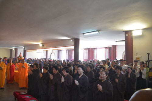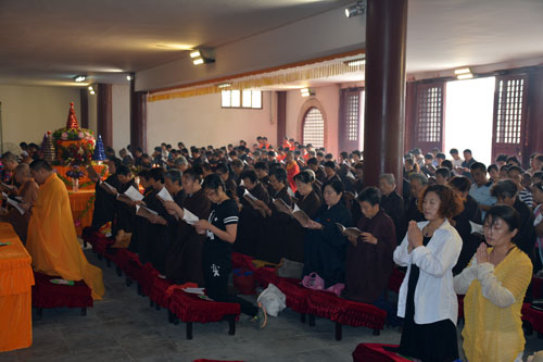 8月25日下午3时洒净,8月26日上午法会正式开始。兴化寺监院常信法师在卧佛殿主法,恭敬拈香,礼拜世尊,并带领全寺僧众和来自苏鲁豫皖周边地区的护法居士四百余人同声梵唱,虔诵大悲经文。法会期间,四众弟子恭诵《地藏经》、《盂兰盆经》。随喜信众藉著供佛斋僧普度的功德力,普愿以此功德所有与会者业障消除,福慧增长;祈愿正法久住,社会和谐,风调雨顺,国家昌盛,人民安乐。