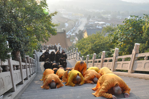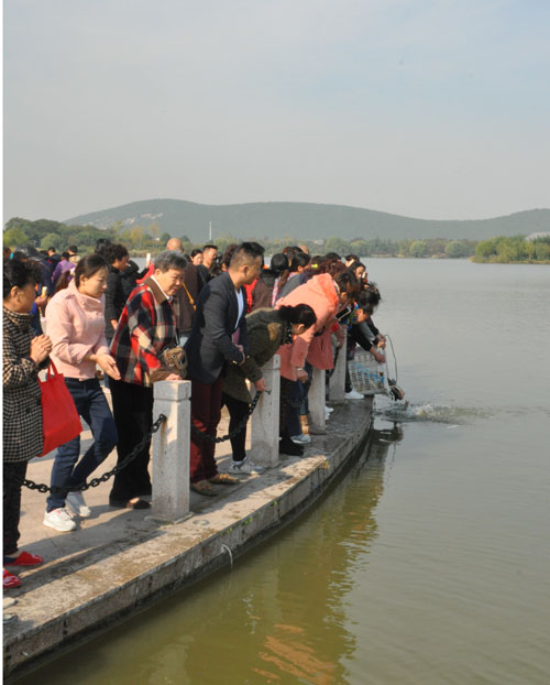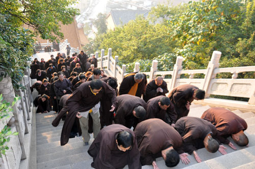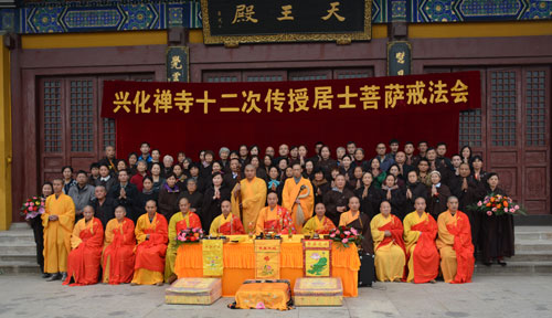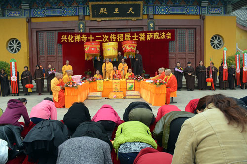 10月31日(九月十九日)早晨7时,为感念观音菩萨慈悲,兴化寺方丈果光大和尚带领僧人和千余居士,从兴化寺东门沿台阶朝山,三步一叩首,虔诚地跪拜、诵念观世音菩萨,直达大佛殿。朝拜时间延续一个多小时,四众弟子虔诚之心,令人赞佩!上午8时30分,果光大和尚率众在兴化禅寺东山门举行隆重的放生仪式,诵经念佛,为四众弟子祈福。之后,载满鲫鱼、鲤鱼、泥鳅的两辆卡车驶向小南湖,将两万多尾生灵放归大自然。当天下午2时30分,兴化寺第十二次传授居士菩萨戒法会在天王殿前广场隆重举行。100多名居士,依据佛教仪轨,恭迎果光大和尚、常信法师、明德法师为其授菩萨戒。同时为200多名在家居士传授三皈,愿居士一心向佛,早获利益。