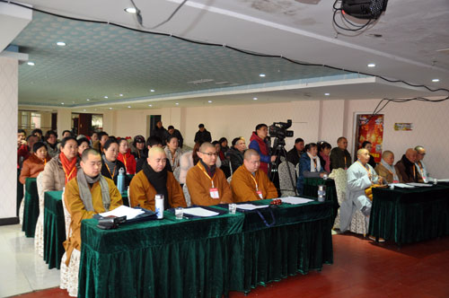 大会在庄严地国歌声中隆重开幕。果光大和尚首先代表徐州市佛教协会向四众开示。他要求大家坚持爱国爱教,与党和政府保持一致。时刻怀抱知恩报恩心态,上报四重恩,下济三途苦,以出世的情怀,广作入世的事业,把佛教事业的发展融入到全面实现中国梦建设之中。勤于修行,教化众生,化解社会矛盾,维护社会稳定,充分发挥佛教对社会的整合作用,增强爱国爱教的自觉性和积极性,实践佛教慈悲济世的情怀。其次是加强自身建设,提高四众素质。以佛教的正信、正行作为自已的行为准则。广泛联系佛教信徒和信教群众同心同德,共同努力,内强素质,外塑形象。引导佛弟子坚定信仰、以戒为师、勤修三学、严肃道风。三是不断强化法制观念,完善各项规章制度,做到学法、懂法、守法、护法,自觉抵制和反对违反法律、法规的行为。四是发扬佛教慈悲理念、积极投身社会公益活动。身为佛子,当以出世的智慧,慈济世间苦难之人。要发扬“人间佛教”思想,引导四众弟子立足于五戒、十善的基本伦理道德生活,净化社会、净化人心。发扬慈悲济世的大乘佛教精神和“不为自己求安生,但愿众生得离苦”的菩萨精神,本着佛陀“众生平等”的教导和无缘大慈、同体大悲的情怀,建立深心广大心,生起信愿行,发大菩提,广作慈善事业,扶危济困,关心老弱病残,援助失学儿童等弱势群体等义行善举。果光大和尚最后预祝大会功德圆满,与会大众身心清净,六时吉祥。
