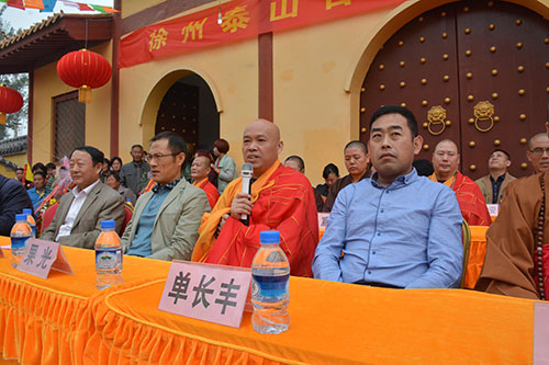 出席今天庆典仪式的领导有:徐州市民宗局副局长单长丰,徐州市民宗局宗教处处长薛亚军,铜山区民宗局局长周保华以及徐州各县区宗教局、各县区佛教协会领导等。出席庆典仪式的大德法师有兴化禅寺方丈果光大和尚,山西太原菩提寺方丈大空大和尚,徐州宝莲寺方丈觉耀大和尚,徐州市佛教协会副会长、徐州泰山寺住持合愿法师,徐州市佛教协会副会长、徐州大士岩住持能海法师,徐州市佛教协会副会长、徐州慈济庵住持能宣法师,铜山区佛教协会副会长源佛法师,徐州广化寺住持宏广法师,普照寺住持满愿法师,徐州东山寺监院宏愿法师,徐州奉亲庵住持能通法师等。
