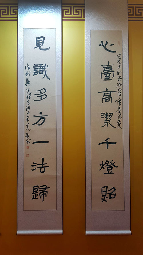 与此同时,11月5日下午,山东省佛教界书画展,在青岛湛山寺上客堂一楼书画展厅隆重开幕。祖籍山东郓城的果光大和尚,有两幅书法作品入选。这两件作品分别是五言对句:《莲花开五境 贝叶注三家》、七言对句:《心台高洁千灯照 见识多方一法归》。参观书画展的高僧大德、艺术名家,对果光大和尚的书法作品评价甚高。