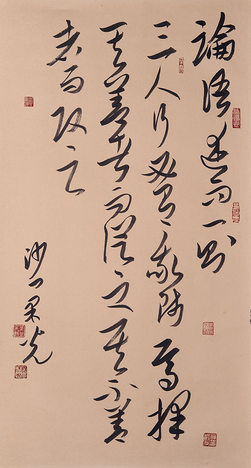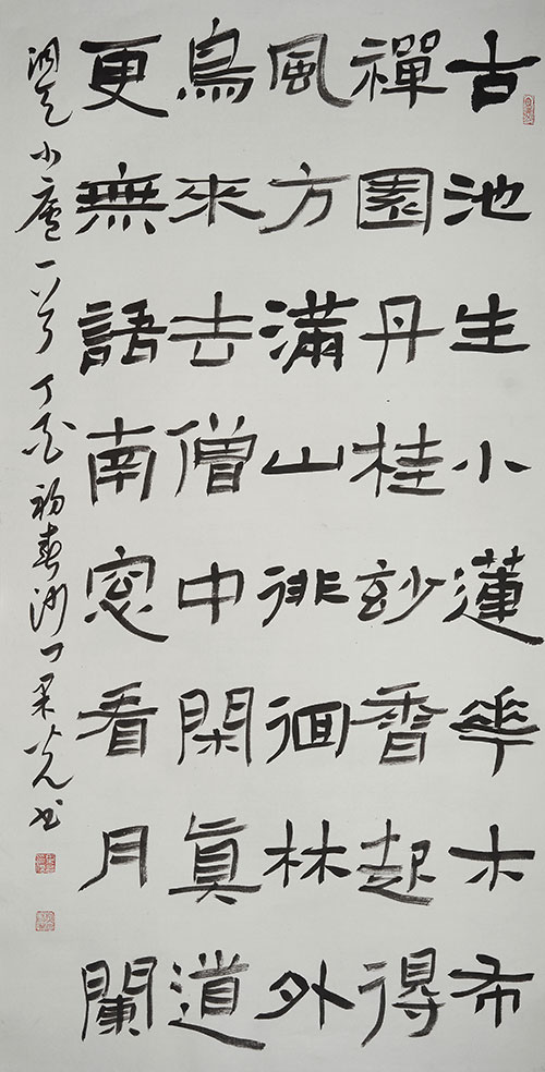 他注重根正,认真临摹过北魏、汉、唐著名经典碑帖。他的真书认真临摹过北魏峻宕朴茂的张黑女墓志、古厚渊懿的郑文公碑;隶书认真临摹过东汉瘦劲恣肆的石门颂、修饬紧密的史晨碑、圆润婉约的曹全碑、淳厚劲秀的张迁碑;行草认真临摹过唐代孙过庭的书谱序;小草认真临摹过唐代怀素的千字文……看他的书法笔迹韵味,不论真草隶篆,基本上都做到了清净脱俗。他的篆书大中有细,他的隶书刚中有柔。他更喜欢的是草书,认为草书更能比较自由地表达自己的心迹。他不仅工书法、懂画格,而且擅诗律、谙枰理,这些都在心灵的韵律上得到了契合和统一。
