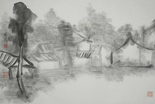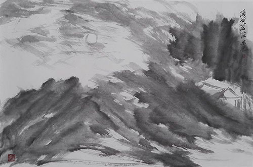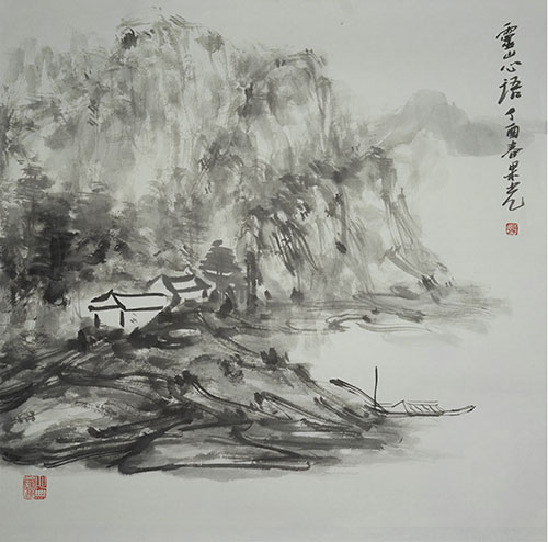 果光禅师的山水,用超越、通达、澄明的态度观照山水之美,不墨守成规,有一种难得的自信,任由情绪的驱使,放笔直取,以率意的笔线勾勒点染,铺排出大的格局框架。果光虽未专攻书、画和诗文,但因在佛学上的高深修养,使他在精神追求上已经达到一种难得的禅境,书法、绘画和诗文出手的格调就异于常人。假以时日,一定会达到思行合一的更高境地。