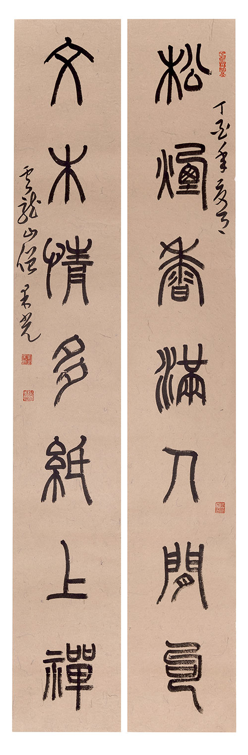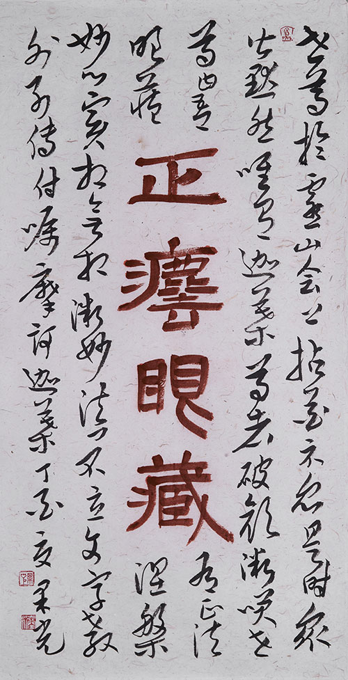 观看他的书道作品,隶书、楷书、行书、草书、篆书等均十分可观,不仅能体现各朝书风、携文人清雅品味,还凸显出其佛学修养、文化修养、诗文绘画修养等在作品中的圆融。果光禅师的作品可以参用其他书体的特点和表现形式,内容与形式的结合不仅适宜,且皆有气象,在其一字、一章的表现中均有上千年书法史的圆融和兼通做基础,有勤学和参悟来活化,能尊重常规而不拘于程式,兼用“理入”与“行入”、渐悟与顿悟、化境与创新、破与立、继往与开来等法门,在书道创作中多次印证了佛教思想和精神的宏大与开放,以及禅学的质朴与高妙。其作品不仅有章有法,还有其个性的特色和参悟的灵光,清雅之气透纸而出、沁人心脾,气势、意境、风格、技法、韵致、情趣等也得到了很好的张扬。其不少作品既有弘一风范,又有自身特色,其书学造诣不言自明,读之、品之,倍觉享受。