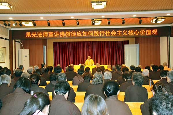 佛教徒应如何践行社会主义核心价值观?果光大和尚从“什么是社会主义核心价值观”、“践行社会主义核心价值观,是促进宗教与社会主义社会相适应的必然要求”、“努力挖掘佛教中的积极因素,为丰富社会主义核心价值观作出积极贡献”、“要发挥佛教徒在弘扬和践行社会主义核心价值观方面的作用”、“践行社会主义核心价值观,要发扬爱国爱教的优良传统,从身边做起、从我做起,首先做好自己本职工作”等五个方面,向信众作了深入细致而又详尽的阐述。