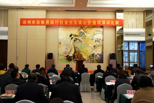 11月24日,徐州市社会主义核心价值观进宗教场所活动现场推进会及全市宗教界践行社会主义核心价值观演讲比赛在贾汪区召开。市民宗局局长党组书记王晓松带领市民宗局全体领导成员、机关各处室负责人,各县(市)、各区民宗系统干部及宗教界代表人士共150人参加了会议。徐州市佛教协会会长、兴化寺方丈果光大和尚出席会议并发言,佛隽法师代表兴化寺参加了演讲比赛。