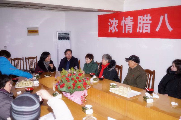 今年腊八节盛况空前的重要原因是徐州市民宗局在总结历年腊八施粥经验的基础上,组织市佛教协会联合全市佛教场所开展了“浓情腊八,爱暖彭城”活动。一改过去寺院单纯施粥的方式,积极开展了“两请四送”活动。“两请”:邀请徐州好人代表喝粥、邀请市民就近到各宗教场所领取腊八粥。“四送”:为主城区环卫驿站的环卫工人送粥、为空巢老人上门送粥、为地铁一线工人送粥、到敬老院、福利院送粥。徐州市民宗局局长王晓松、副局长黄修建等领导凌晨就带领民宗局的各级工作人员来到兴化寺等各寺院,现场指导活动的开展,给义工们加油鼓劲,接待应邀来兴化寺品粥的徐州好人代表。上午九点,徐州市政协副主席张耀环也来到兴化寺慰问徐州好人代表,和宋光迎老人等徐州好人代表互致节日祝福。