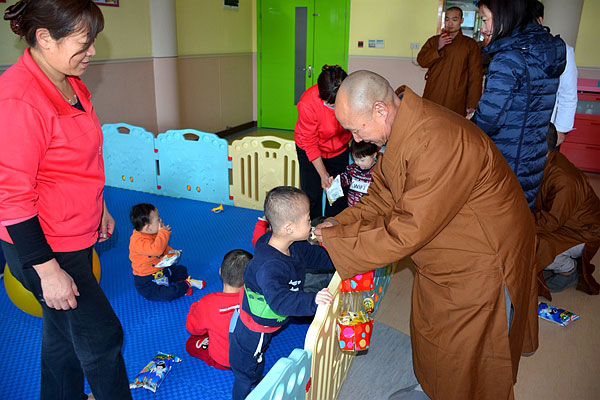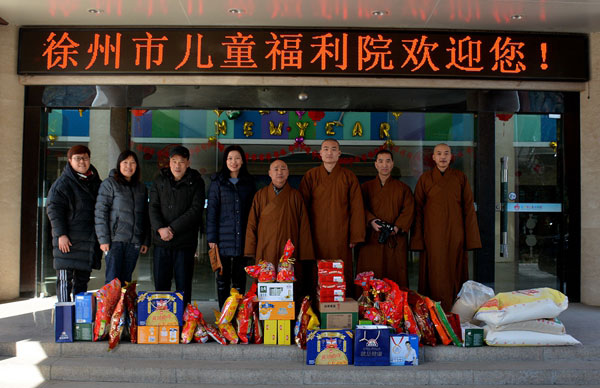 2018年2月12日下午,徐州市佛教协会会长、兴化禅寺方丈果光大和尚委托监院常信法师、知客佛隽法师、僧值大通法师和慈善功德会陈主任等一行数人,给社会福利院可爱的孩子们送去了兴化禅寺全体常住法师和义工的新春祝福和爱心牵挂,同时也送去了价值3000余元的食品、米、面、油等物。
