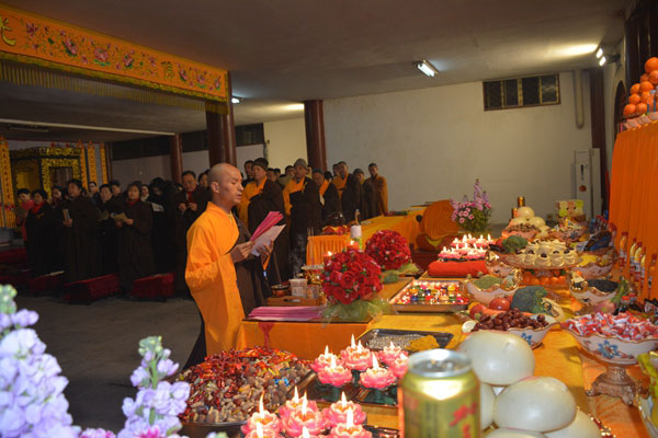 初九凌晨4时30分,新春供佛斋天祈福法会准时在卧佛殿举行。兴化禅寺方丈果光大和尚主法,他率领四众弟子如律如法的熏坛洒净、请圣、献供、上供、回向、送圣,共同礼拜《金光明忏斋天法仪》,礼敬供养三宝,持诵《金光明经•空品》,以此为大众祈祷在新的一年继续蒙佛菩萨和龙天善神护佑,保佑与会大众业障消除,福慧增长,吉祥如意,全家安康。