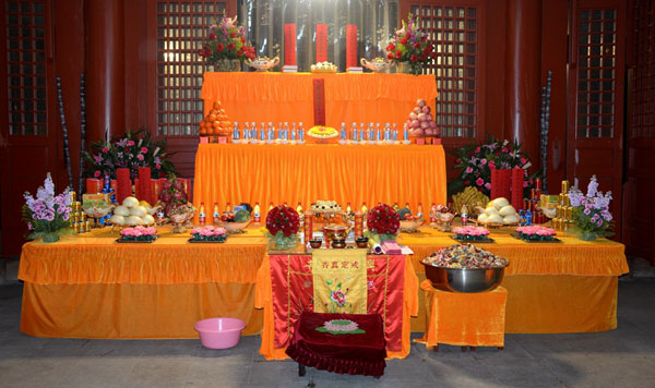 农历正月初八下午,寺院法师就带领善信护法居士提前在卧佛殿布置供台,将寺院虔敬制作的精致糕点、供菜及供果逐一摆放至供台,并伴以香、花、灯、水、果、茶、食、宝、珠、衣等十供养,整个供坛鲜花簇拥,果食丰盛,清净庄严,法喜充满。