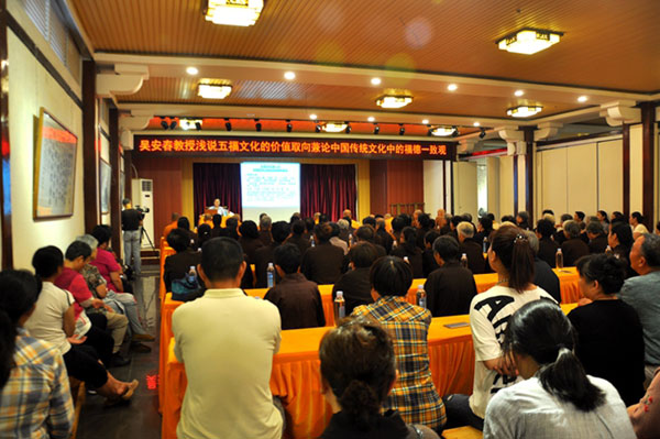 紧接着吴教授又从五福文化隐含着福德一致论的价值运作原理;德是五福之根;“德”“福”一致论是中国社会伦理精神的合理性根基,也是决定个人命运的根基;西方福德一致论;福德一致论的现代意义;如何获得德性等方面,结合自己的切身经历和亲身体会,把五福文化的价值取向和中国传统文化中的德福一致观联系起来,图文并茂,言简意赅地给大家上了生动的一课,博得了阵阵的掌声。