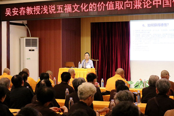 最后,果光大和尚进行总结说:吴教授从五福文化价值取向和德福一致论,作了精彩的演讲,给大家留下深刻的印象,让我们对五福的认识和如何获取德性更加清晰明了,为进一步学习佛法起到了很好的辅助作用,希望大家能学以致用,相信因果,行善积德,在修行的道路上越走越远,最终成就圆满菩提。