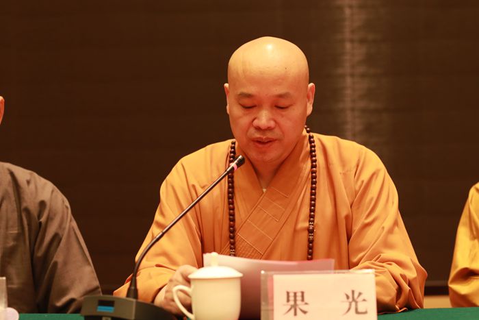 新当选的会长果光法师致闭幕词,他表示将积极引导淮安佛教与社会主义相适应,积极践行社会主义核心价值观,大力弘扬“人间佛教”思想,加强道风建设,在推动佛教中国化建设上获得新进展。