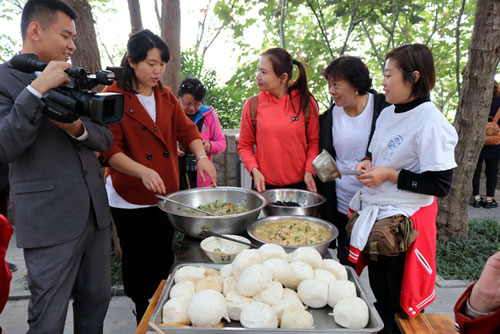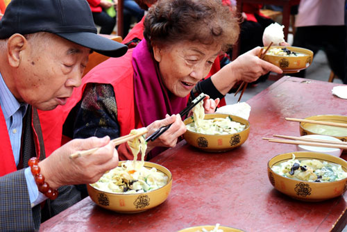刚出锅的面条热气腾腾,再浇上一勺新鲜蔬菜做成的卤子,老人们接过“长寿面”,脸上都洋溢着开心幸福的笑容。果光大和尚慈悲,还给老人们准备了馒头和炒菜,大家一起品素斋,拉家常,平日里再普通不过的一碗素面,却让老人们感到温暖,他们彼此祝福,赞叹社会和谐,深深地感受到党和政府对老年人的关爱之情!