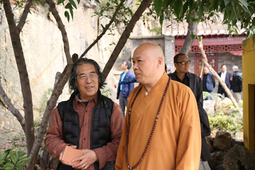 果光大和尚还陪同客人参观了兴化寺明代禅院、洞天小庐和拥有1500多年历史的北魏大佛殿,讲述了大佛和毛主席以及朱元璋的典故,最后来到赵朴初、李可染亲笔题词的唐宋摩崖石刻造像大殿,书画家们对石刻造像非常感兴趣,纷纷赞叹千年古刹兴化寺是一块风水宝地,有这么多文物和古迹,实在是修行难得的好地方。