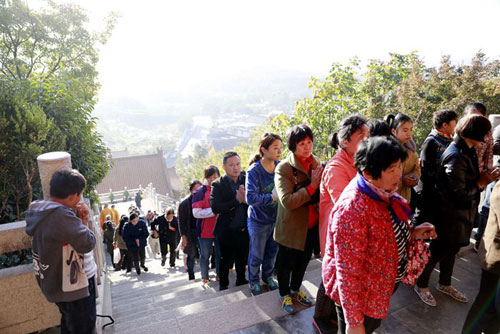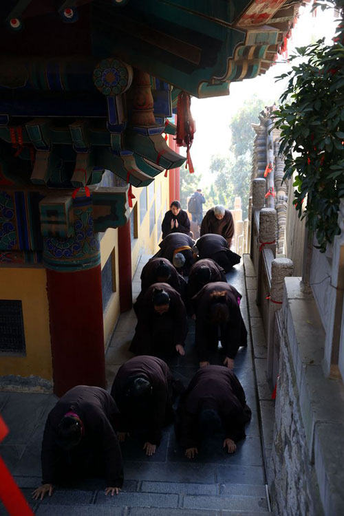 兴化寺在观音菩萨出家之日拜山,至今已延续十余年,果光大和尚三步一拜,虔诚顶礼,兴化寺全体僧众和来自江苏、山东、河南、安徽等地的千余名居士一起朝拜北魏大佛,其中一位92岁高龄的连云港老人也专程赶来拜佛。现场壮观,法喜充满。