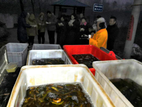 早上五点钟,兴化寺监院常信法师带领功德会的工作人员以及众居士,满载着一万余元的黑鱼、鲤鱼、鳝鱼、泥鳅等各种活鱼,驱车前往京杭大运河徐州段放生。