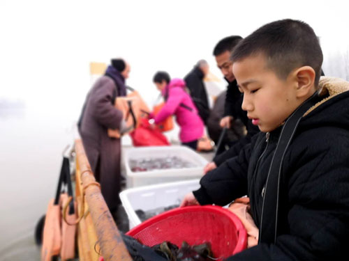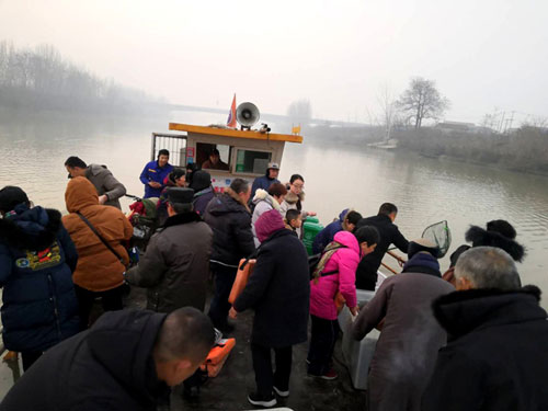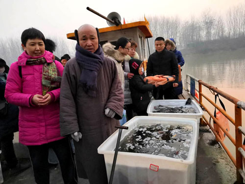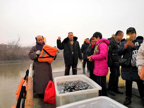 放生仪轨结束后,常信法师带领众居士乘船驶往河中心,将活鱼全部放入奔腾流淌的大运河中,有些鱼儿还在船边徘徊了好久,然后依依不舍地游向远方,回归到大自然的怀抱之中。