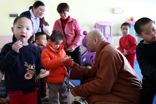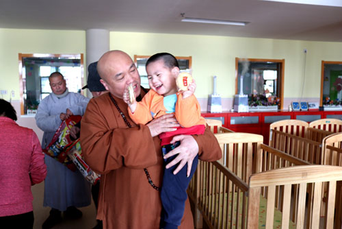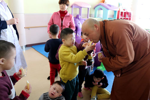 福利院段副院长热情接待果光大和尚一行,感谢兴化寺每年都能想着这些幸运的孩子们。