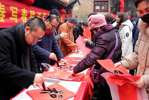 应方丈果光大和尚邀请徐州著名书画家马榕君、刘淮、罗东风、王兆君、余中元、张超、孟宇等现场挥毫泼墨,为大家在寒风里送上了喜庆的福字和红红的春联,祝福前来参加活动的市民春节吉祥,幸福美满。