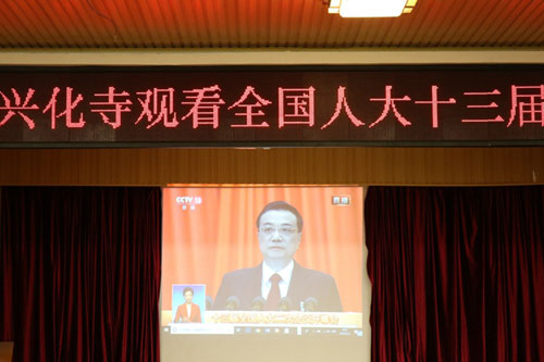 徐州市佛教协会会长、兴化寺方丈果光大和尚带领僧众在兴化书院集体观看现场直播,认真聆听李克强总理关于政府工作的报告。