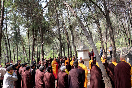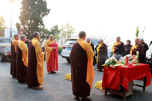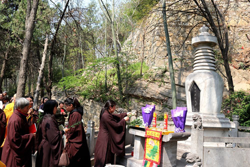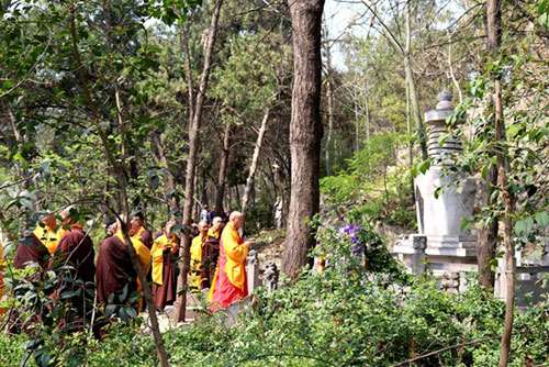 十点,果光大和尚又率僧众,依次在大雄宝殿、天王殿、客堂、祖堂等处举行普供,然后一起来到南门外的塔林祭祖,大众梵唱香赞、上供礼拜、以白菊花祭祀追思,表达了对历代祖师先贤的敬重之情与缅怀之意。