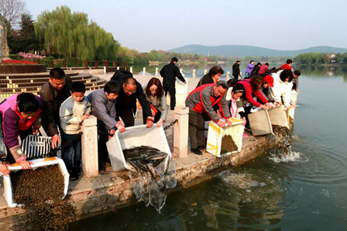 早上七点,兴化寺方丈果光大和尚拈香主法放生法会,杨枝净水遍洒甲鱼、黑鱼、黄鳝、泥鳅、牛蛙及蜗牛等物命,大和尚带领大众请圣、忏悔、授三皈依…… 法会庄严肃穆,安乐祥和。最后,在声声佛号当中,放生法会圆满结束。