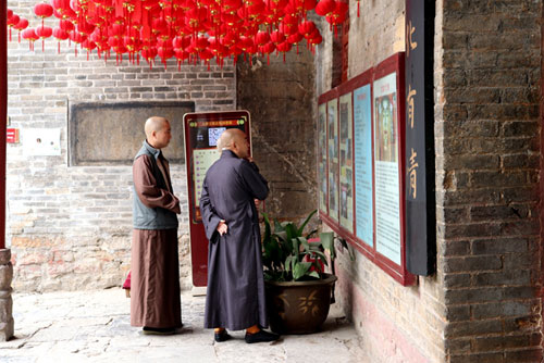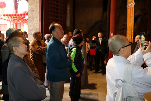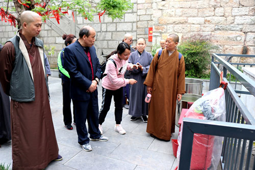 客人们在兴化寺寺管会工作人员的陪同下,浏览参观了明清小院、北魏大石佛、唐宋摩崖石刻、明代钟鼓楼等历史名胜古迹,并学习观摩了兴化寺在安全方面所做的日常工作,陪同人员就北魏大石佛的雕刻年代、唐宋摩崖石刻的发现经过、钟楼宣德铁钟的铸造保存以及兴化寺丛林历史文化做了详尽而生动的讲解。