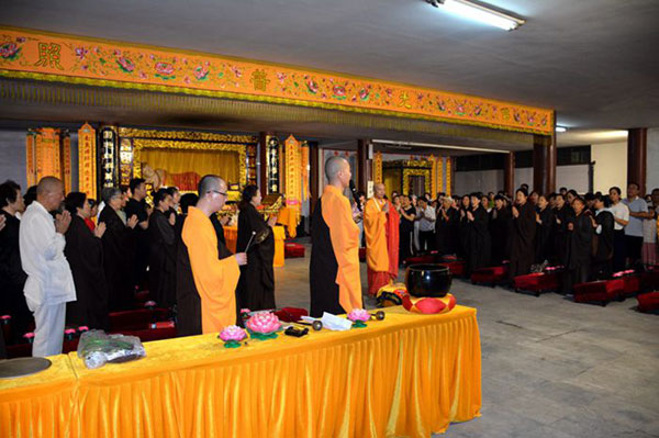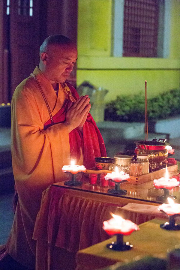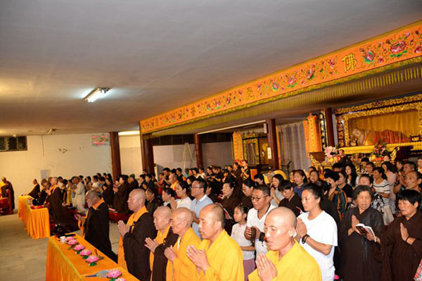 在皎洁的月光下,四众弟子合十,果光大和尚宣读祈愿文,共同祈愿正法永驻、世界和平、社会和谐;祈愿中华民族昌盛、国家富强、百业兴旺、人民幸福;祈愿经济发展、文化繁荣、风调雨顺、五谷丰登;与会众信,凡有所求,皆具圆满!