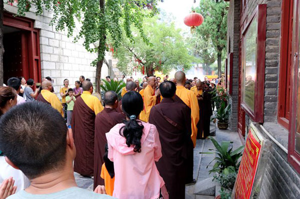 农历八月十五是中国传统的中秋节,这一天,恭逢月光菩萨圣诞。上午,四众弟子在大雄宝殿内举行祝圣祈福和上供法会,法会由兴化寺方丈果光大和尚拈香主法,以音声作佛事,以梵呗唱和谐,以香花果品,梵呗雅韵供养十方诸佛菩萨,以此祈愿世界和平,国泰民安,风调雨顺,灾难消除,佛日增辉。虔诚的居士们随众上大供,凡诸功德,悉皆回向法界一切有情。