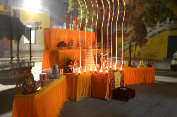 晚上七点,皎月圆满,行于虚空,清净无碍。兴化寺卧佛殿前设供灯法台,以香花、茶饮、水果、食品供养诸佛菩萨,庆祝中华人民共和国成立七十周年传灯法会,再现了中秋拜月祈福的传统文化场面,表达了兴化寺全体僧众祈愿“祖国繁荣昌盛,人民生活和美”的美好愿望。