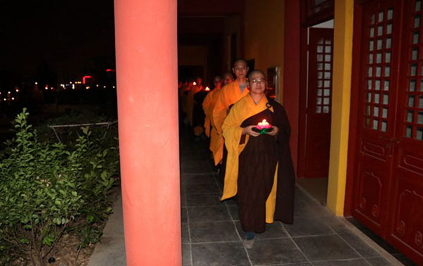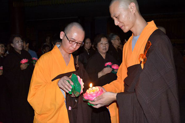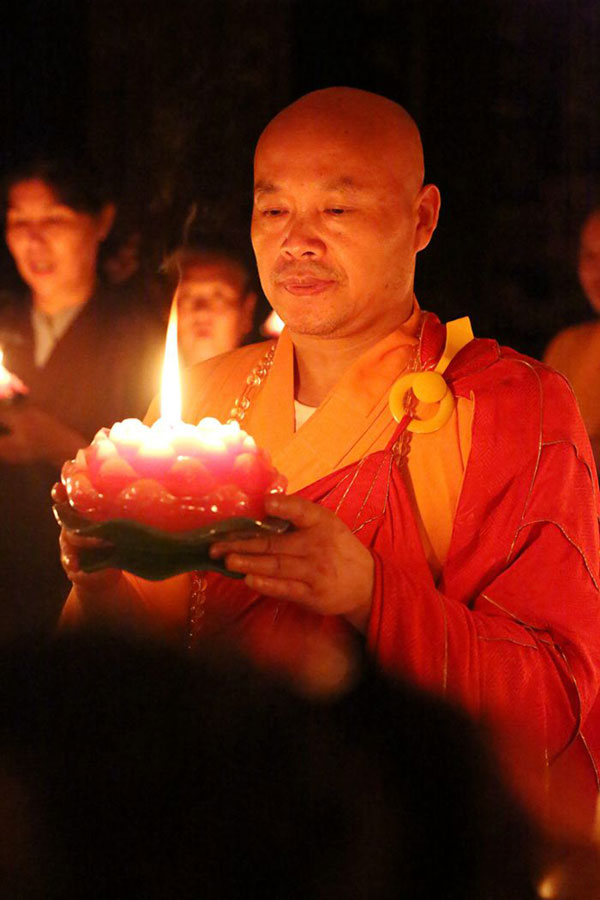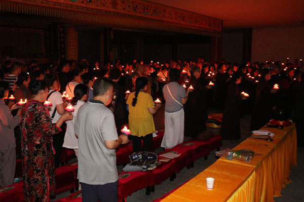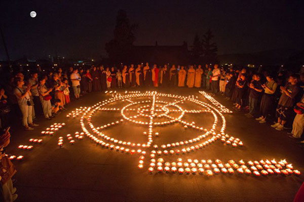 当代表着智慧和光明的一盏盏吉祥灯被依次点燃,一时间,梵呗声声,烛光摇曳,法师和信众持灯绕佛,在庄严的佛号声中汇集在天王殿广场,摆成了巨大的法轮图案,寓意着正法久住,法轮常转!
