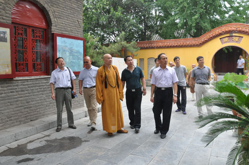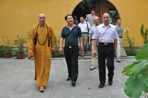 中秋、国庆两大节日即将来临,为保障节日期间寺院等公共场所人身、财产、文物安全,2014年8月27日上午,徐州市政府办公室副调研员靖飞、综合三处副处长李楠,受市领导委托,在市民宗局黄修建副局长陪同下,到兴化寺检查安全、消防工作。兴化寺方丈果光大和尚,热情接待了市政府、市民宗局领导一行。