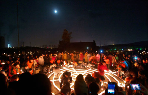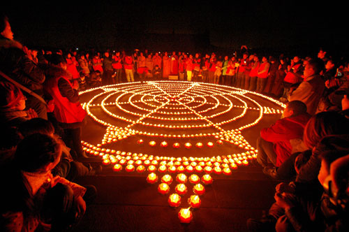 月照苍穹,大地一片辉煌。此刻,四众弟子手中的莲花灯逐一点燃,由法师排班列队,依次传灯行进至天王殿门前广场。宽阔平坦的广场上,四众弟子用点燃的莲花烛灯,排列成九轮绽放光芒的巨型法轮图案。此时的天王殿前,烛灯熠熠,伽蓝生辉,缤彩纷呈,蔚为壮观,十方信众,共赴莲会,张灯结彩,祈福纳祥。